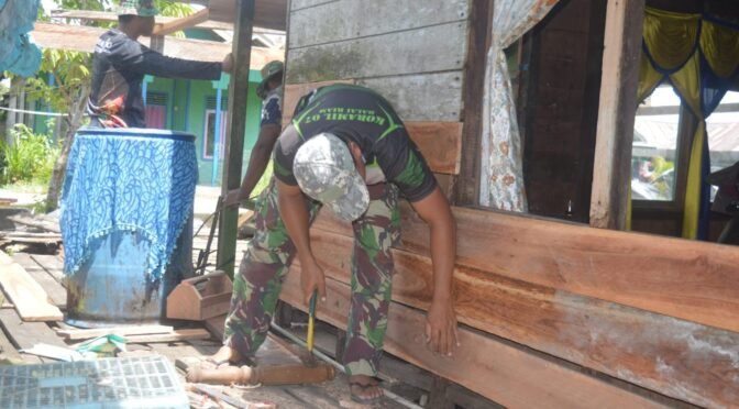 Seperti yang terlihat pada saat pengerjaan RTLH Koptu Saiful Anggota Satgas TMMD mengikuti program TMMD bersama rekan-rekannya sedang bekerja di sasaran dengan bahan dasar kayu.