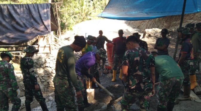 Proses pencampuran material ini dilakukan dengan penuh ketelitian untuk memastikan kualitas bangunan yang kuat dan tahan lama. Personel TNI dan masyarakat setempat bekerja secara bergantian, mencerminkan sinergi yang erat antara aparat dan warga dalam membangun infrastruktur yang bermanfaat bagi desa. Semangat kebersamaan yang ditunjukkan dalam kegiatan ini menjadi bukti nyata kepedulian TNI terhadap kesejahteraan masyarakat.