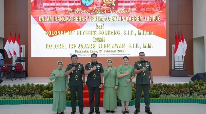 Jabatan Kasrem 102/PJG secara resmi diserahterimakan dari Kolonel Inf Ulysses Sondang, S.I.P., M.Hum., yang akan melanjutkan tugas sebagai Pamen Ahli Bidang Komlek Pussenif, kepada Kolonel Inf Jajang Kurniawan, S.I.P., M.M., yang sebelumnya menjabat sebagai Dirbinum Poltekad Kodiklatad.