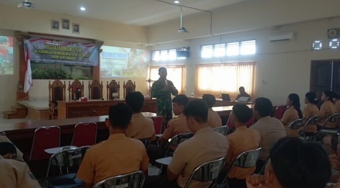Tabanan – Dalam rangka program nonfisik TNI Manunggal Membangun Desa (TMMD) ke-123, Kodim 1619/Tabanan menggelar sosialisasi rekrutmen prajurit TNI kepada siswa SMA Negeri 1 Selemadeg Kab. Tabanan yang diberikan langsung oleh Dan SSK TMMD ke-123 Kodim Tabanan Kapten Kav Bekti Aji Sayekti, S.T.Han, dan bertujuan untuk memberikan pemahaman kepada para siswa tentang peluang dan persyaratan untuk bergabung menjadi prajurit TNI, Jumat (7/3/2025)