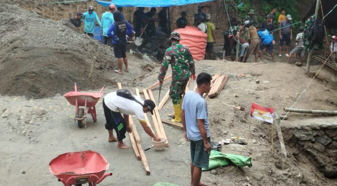SINJAI. Semangat gotong royong terlihat jelas dalam pelaksanaan program TNI Manunggal Membangun Desa (TMMD) ke-123 Kodim 1424/Sinjai. Warga setempat dengan antusias turut serta membantu Satgas TMMD dalam perakitan papan mal untuk pengecoran jembatan yang sedang dibangun di Desa Lamatti Riawang, Kecamatan Bulupoddo, Kabupaten Sinjai, Kamis (27/02/2025)