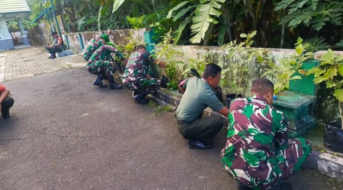 Klungkung,- Setelah pelaksanaan apel pagi, personel Koramil 1610-01/Klungkung dipimpin langsung Pjs Danramil Lettu Inf I Nyoman Suarata melaksanakan kegiatan bersih-bersih pangkalan, Kamis ( 27/02/25 ).