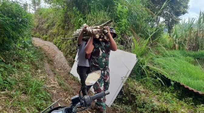 Agam – Anggota Satgas TMMD ke-123 Kodim 0304/Agam, Pelda Endang membantu mengangkat tebu warga Pahambatan, Nagari Balingka, Kabupaten Agam, Minggu, (23/2/2025).
