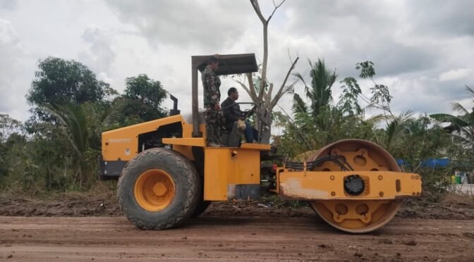 Sukamara – Perbaikan badan jalan sepanjang 6.080 M yang merupakan sasaran pokok program TNI Manunggal Membangun Desa (TMMD) Ke 123 Kodim 1014/Pbn di Desa Nibung Kecamatan Jelai Kabupaten Sukamara terus menunjukan peningkatan, hingga saat ini sudah pada sampai pemadatan pada badan jalan, Minggu (09/03/2025).