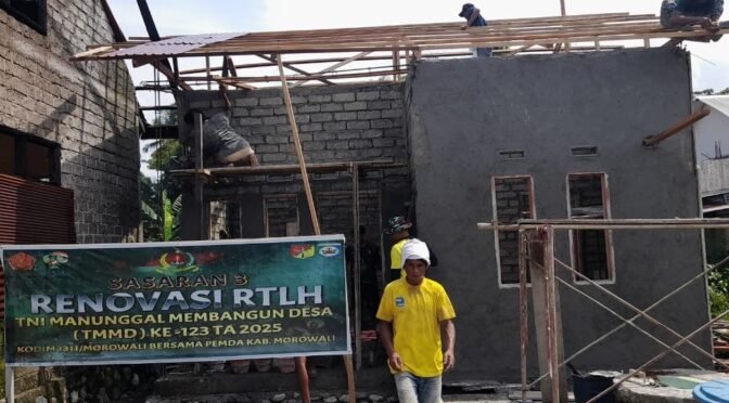 Morowali – Program pembangunan Rumah Tidak Layak Huni (RTLH) yang menjadi salah satu sasaran fisik dalam TNI Manunggal Membangun Desa (TMMD) ke-123 Kodim 1311/Morowali masih terus berjalan. Pada Senin (10/03/2025), Satgas TMMD terlihat sedang melakukan pemasangan atap rumah yang tengah dikerjakan di Kelurahan Lamberea, Kecamatan Bungku Tengah, Kabupaten Morowali.