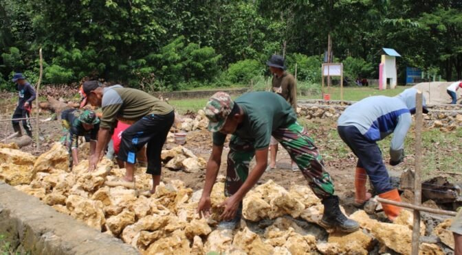 Muna Barat–Walau Panas terik, Anggota Satgas TMMD 123 Bersama warga tetap semangat melaksanakan pekerjaan, Demi menyukseskan TNI Manunggal Membangun Desa (TMMD) ke 123 Kodim 1416/Muna, Anggota Satgas TMMD bersama warga Desa Momuntu Kecamatan Tiworo Tengah Kabupaten Muna Barat, tetap bersemangat melakukan pekerjaan Pembuatan Fondasi Sekolah SDN 5 Tiworo Tengah, Sabtu (22/2/2025).