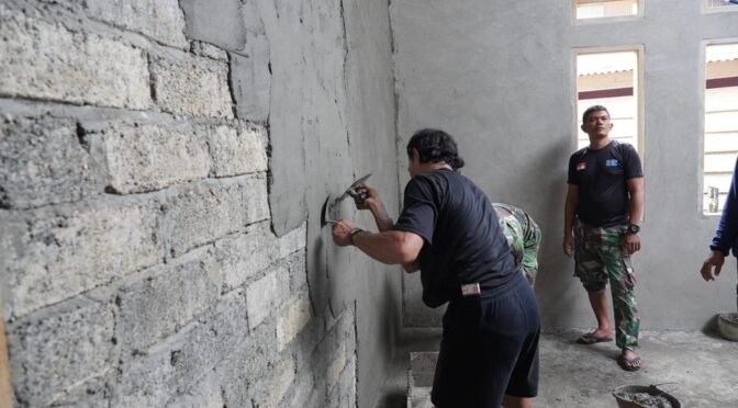Morowali – Proses pembangunan Rumah Tidak Layak Huni (RTLH) dalam program TMMD Ke-123 Kodim 1311/Morowali di Dusun Kajukoo, Desa Bente, Kecamatan Bungku Tengah, terus berjalan dengan penuh ketelitian. Pada tahap pemlesteran dinding, anggota Satgas TMMD bekerja dengan cermat karena tahap ini tidak hanya bertujuan untuk memperkuat struktur bangunan, tetapi juga menentukan kerapian akhir rumah yang sedang dibangun.