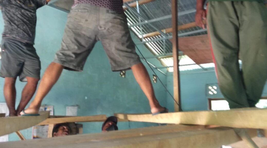 Tampak warga dan Satgas TMMD bergotong-royong satu persatu memasang plafon yang sudah jadi. Dengan kehati-hatian, Satgas dan warga berhasil memasang plafon di bangunan Gereja tersebut.