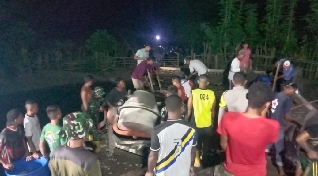 Sumbawa Barat, NTB – Demi menyelesaikan pembangunan jembatan dan pengecoran jalan usaha tani tepat waktu, Satuan Tugas (Satgas) TMMD ke-123 Kodim 1628/Sumbawa Barat bekerja lembur hingga malam hari di Dusun Jorok Tiram, Desa Batu Putih, Kecamatan Taliwang, pada Kamis (6/3/2025) pukul 21.00 WITA.