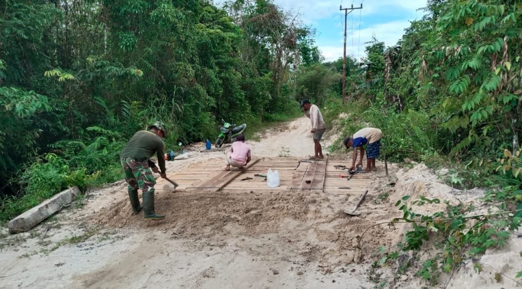 Dengan semangat gotong royong dan pengabdian kepada rakyat, para prajurit TNI bahu membahu memasang papan jembatan sebagai bagian dari infrastruktur vital yang sangat dibutuhkan warga.
