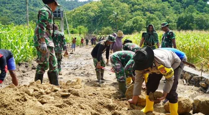 Sumbawa Barat, NTB – Wujud sinergitas antara TNI dan Polri kembali terlihat dalam program TNI Manunggal Membangun Desa (TMMD) ke-123 Kodim 1628/Sumbawa Barat. Personel kepolisian turut membantu Satgas TMMD dalam proses pengumpulan batu sebagai bahan material untuk pembangunan infrastruktur di Dusun Jorok Tiram, Desa Batu Putih, Kecamatan Taliwang, Kamis (20/02/2025).