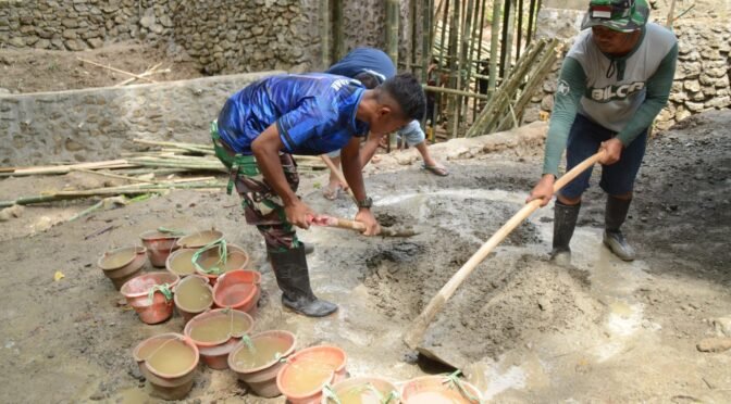 Dengan penuh kekompakan, para personel Satgas TMMD bahu-membahu mengaduk campuran semen, pasir, dan kerikil dengan komposisi yang tepat guna memastikan kualitas bangunan yang kokoh dan tahan lama. Semangat kerja keras mereka menjadi bukti nyata pengabdian kepada masyarakat, demi mewujudkan infrastruktur yang lebih baik bagi warga desa.