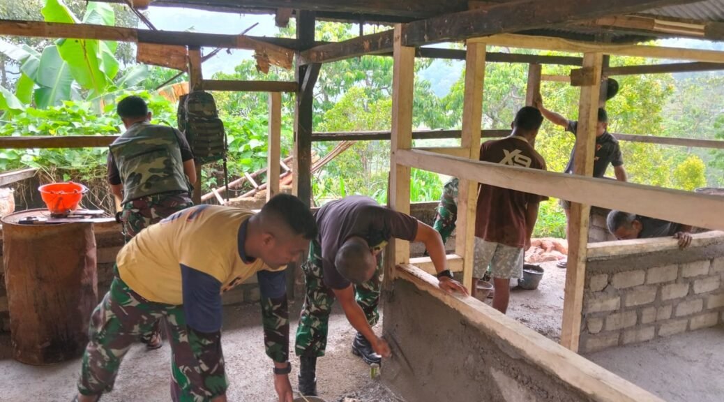 Sejak pagi, aktivitas penuh semangat terlihat di lokasi. Suara palu, gergaji, dan adukan semen bersahutan di halaman rumah Heribertus. Prajurit TNI bersama warga bergotong royong memotong kayu, menata batu bata, dan memperbaiki dinding rumah yang sebelumnya telah rapuh dimakan usia. Pemandangan ini mencerminkan kuatnya hubungan emosional antara TNI dan masyarakat di wilayah binaannya.