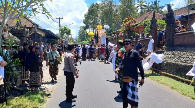 Tampak di tengah-tengah warga, Babinsa dan Bhabinkamtibmas yang dibantu dengan para pecalang menggelar pengawalan dan pengamanan.